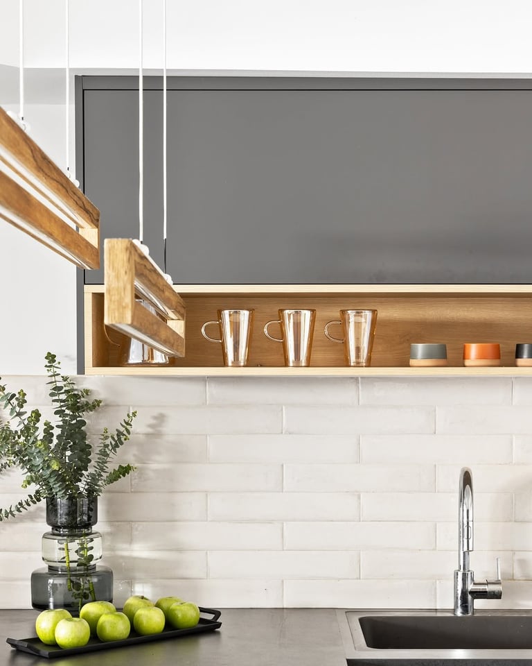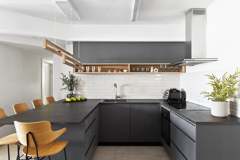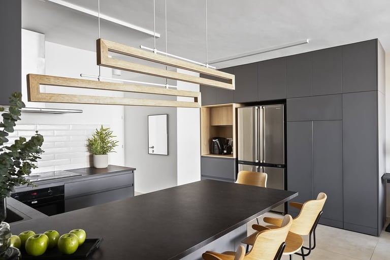 מטבח שחור עם נגיעות עץ אלון בעיצוב ייחודי