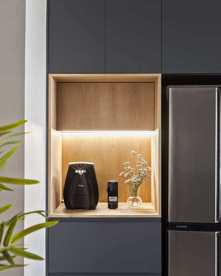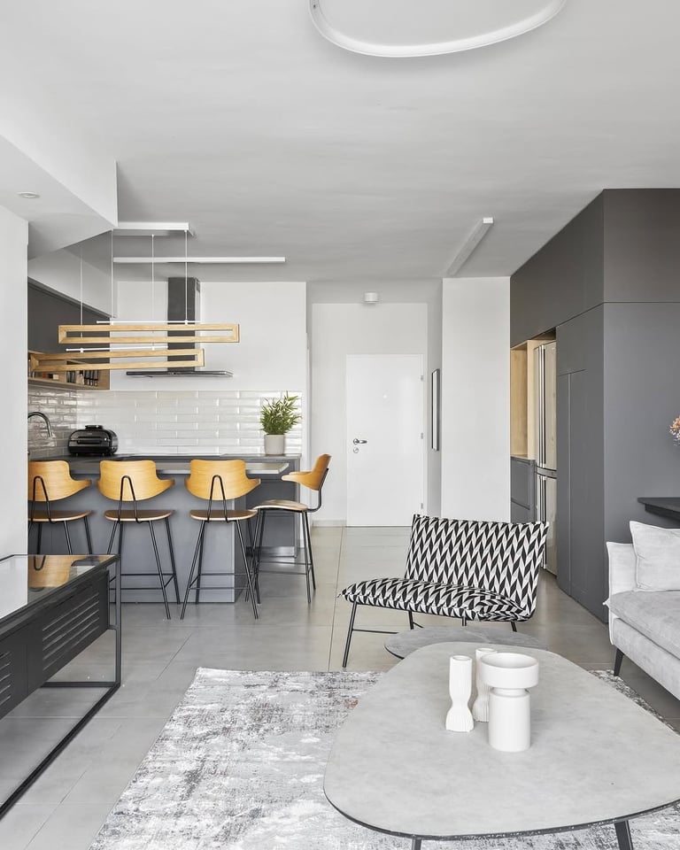 המטבח השחור עם נגיעות עץ אלון בעיצוב ייחודי מציע שילוב מודרני ואופנתי בין הצבע השחור האלגנטי לחמימות עץ האלון הטבעי. העיצוב ללא ידיות מעניק למטבח מראה רך ופשוט, תוך שמירה על נוחות ושימושיות בזכות טכניקות פתיחת הדלתות והארונות בצורה חדשנית. השילוב בין השחור והאלון יוצר איזון מושלם בין יוקרה לנוחות.