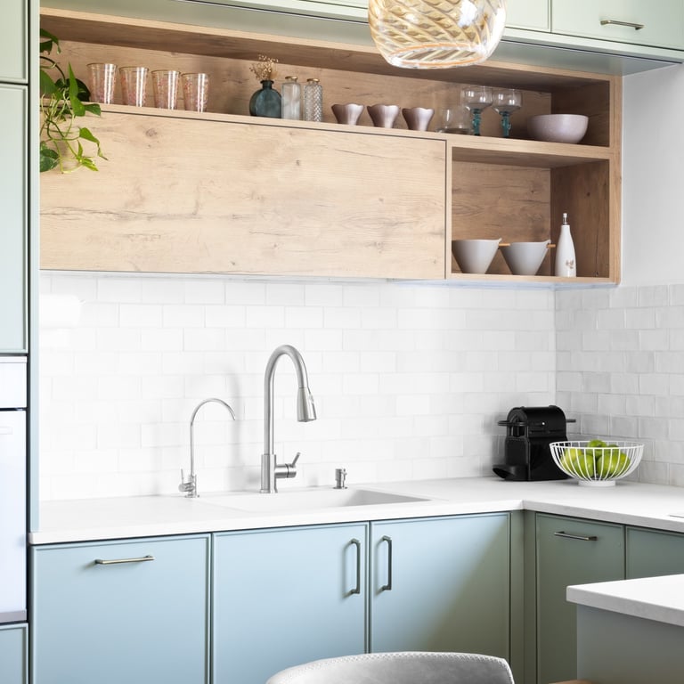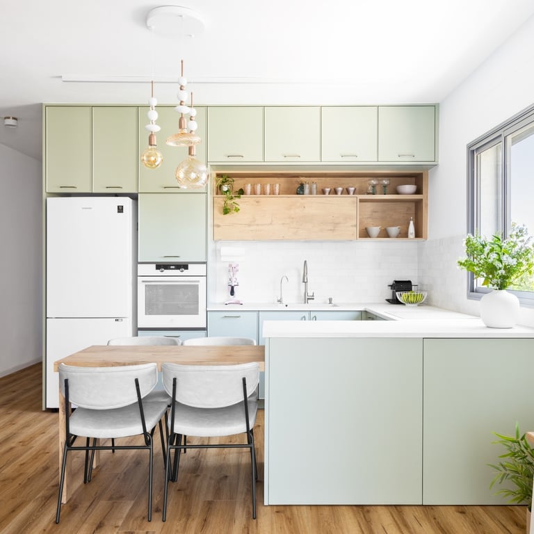 מטבח בצבע פיסטוק עם עץ אלון, שילוב של רוגע ויוקרה